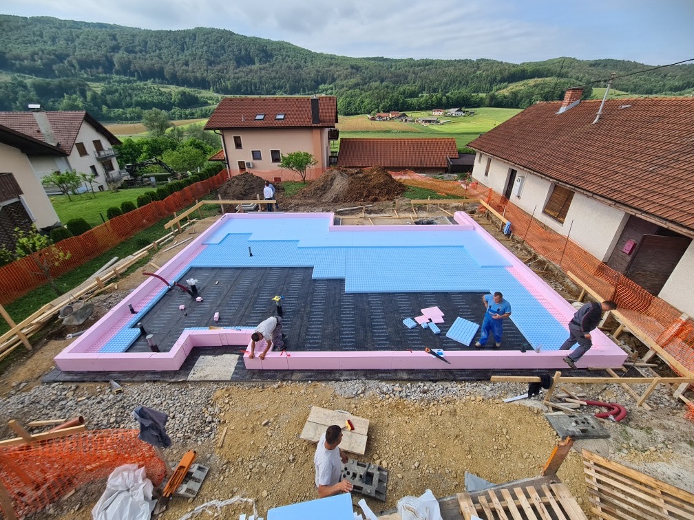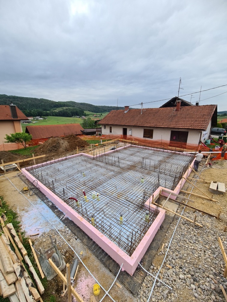 Pred kratkim smo v Trebnjem pričeli z gradnjo enodružinske pritlične hiše z ravno streho. Pod temeljno ploščo je izvedena JUBHome BASE toplotno izolacijska kad debeline 16 cm, tlačne trdnosti 300 kPa, stene pa so predvidene iz JUBHome WALL oblikovnikov debeline 390 mm.