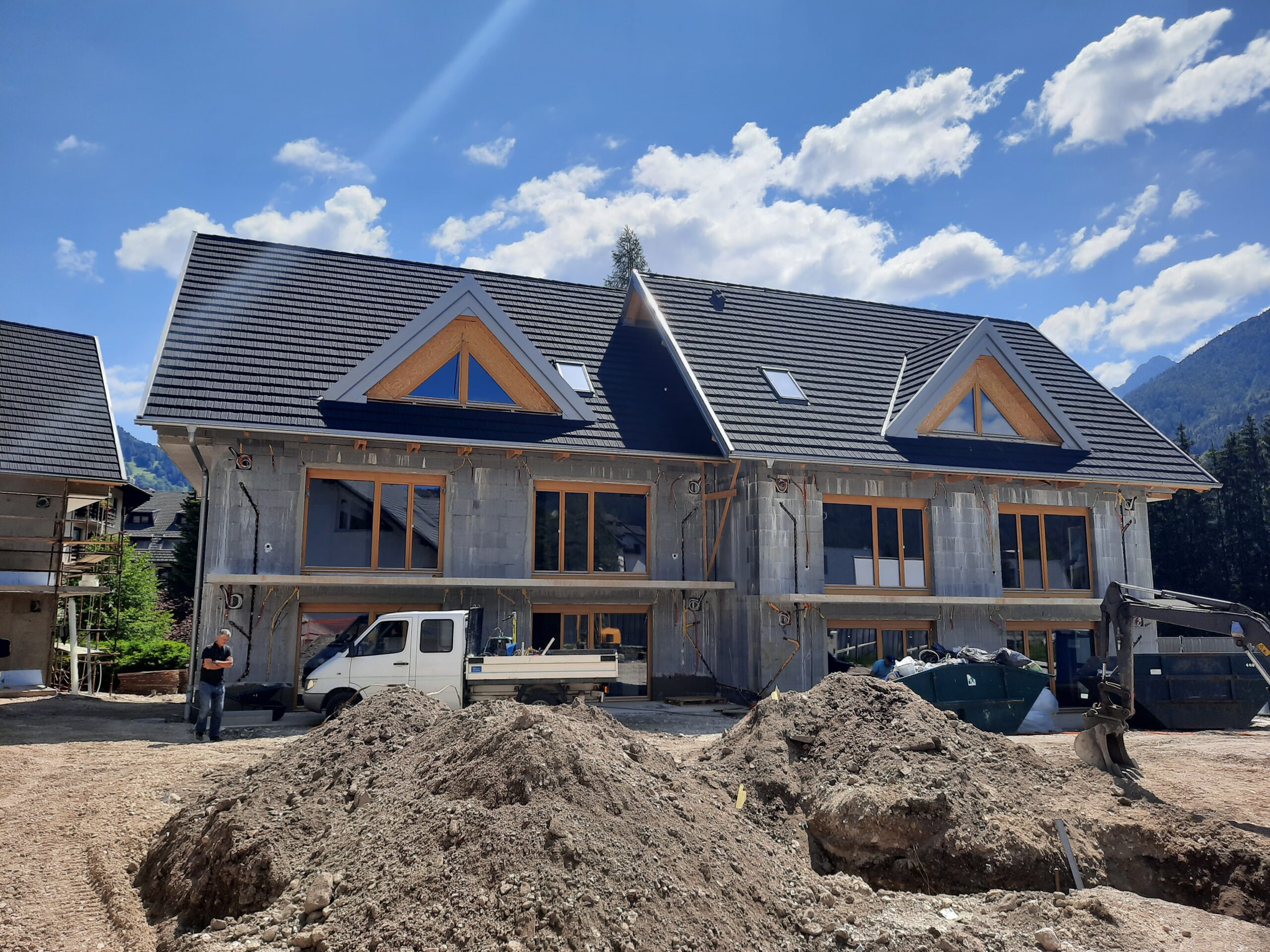 Montaža lesenih oken s 3-slojno zasteklitvijo je končana, prav tako tudi  strojno in elektro instalacijska dela v notranjosti objektov.