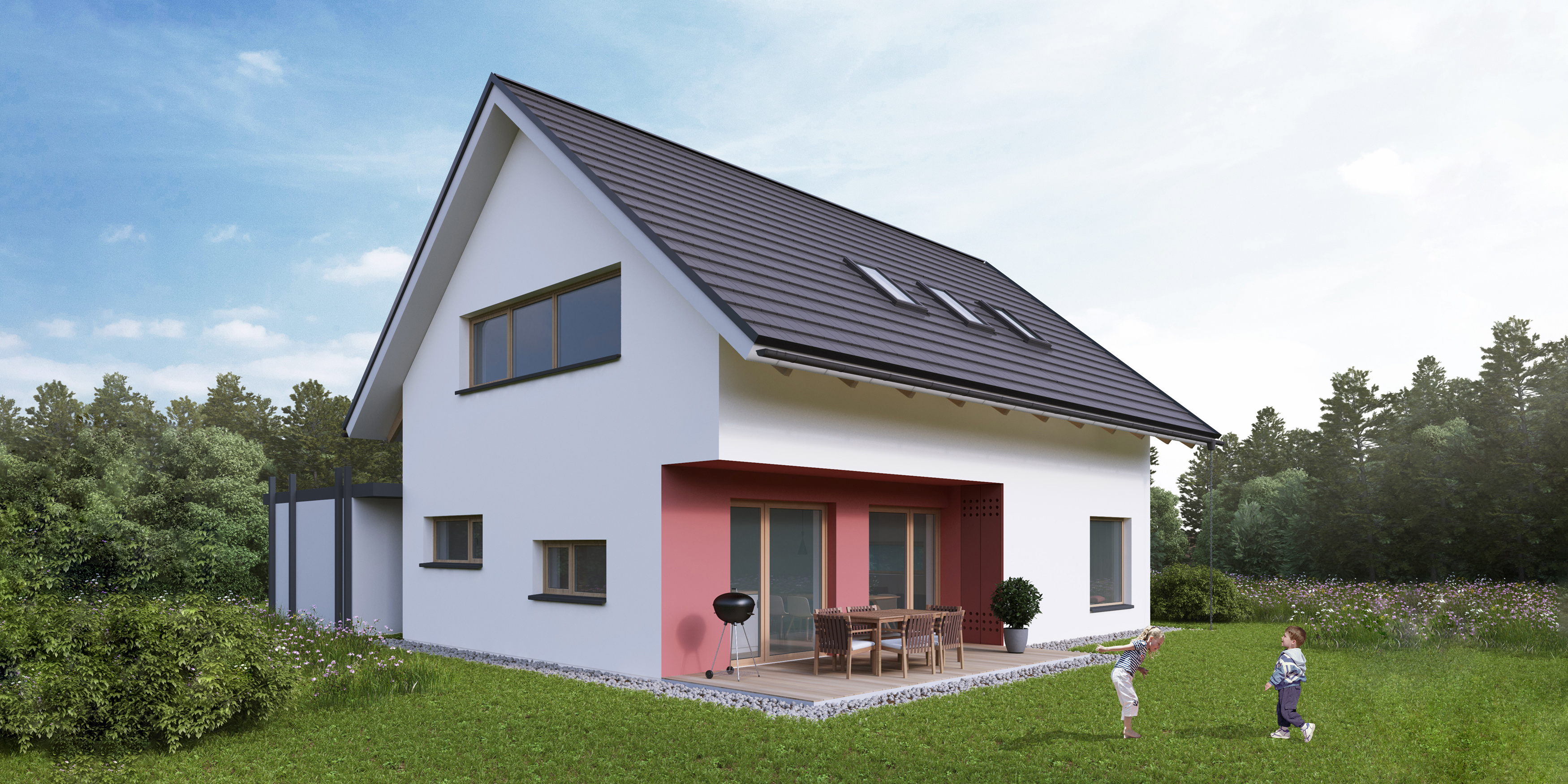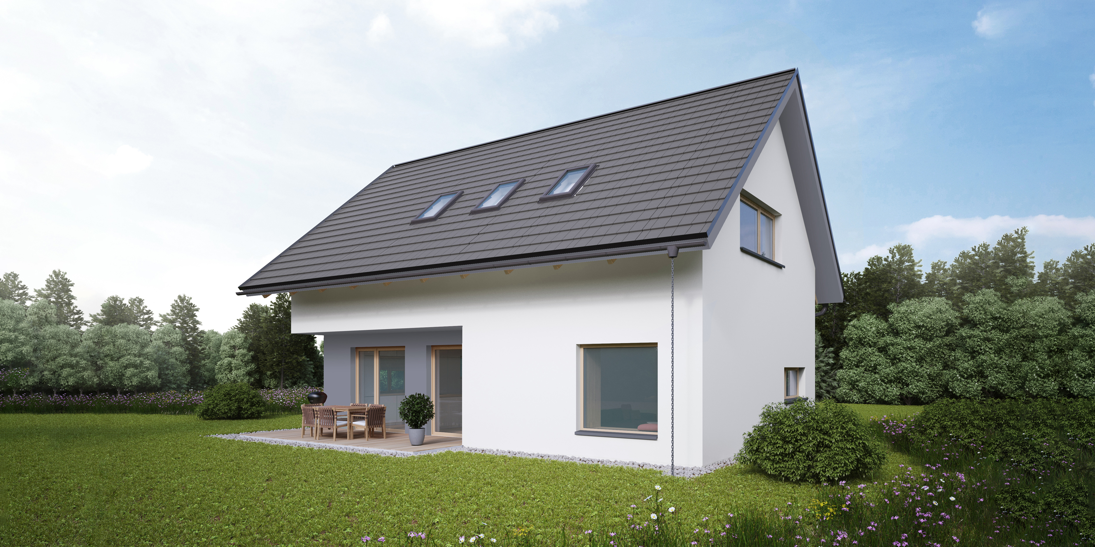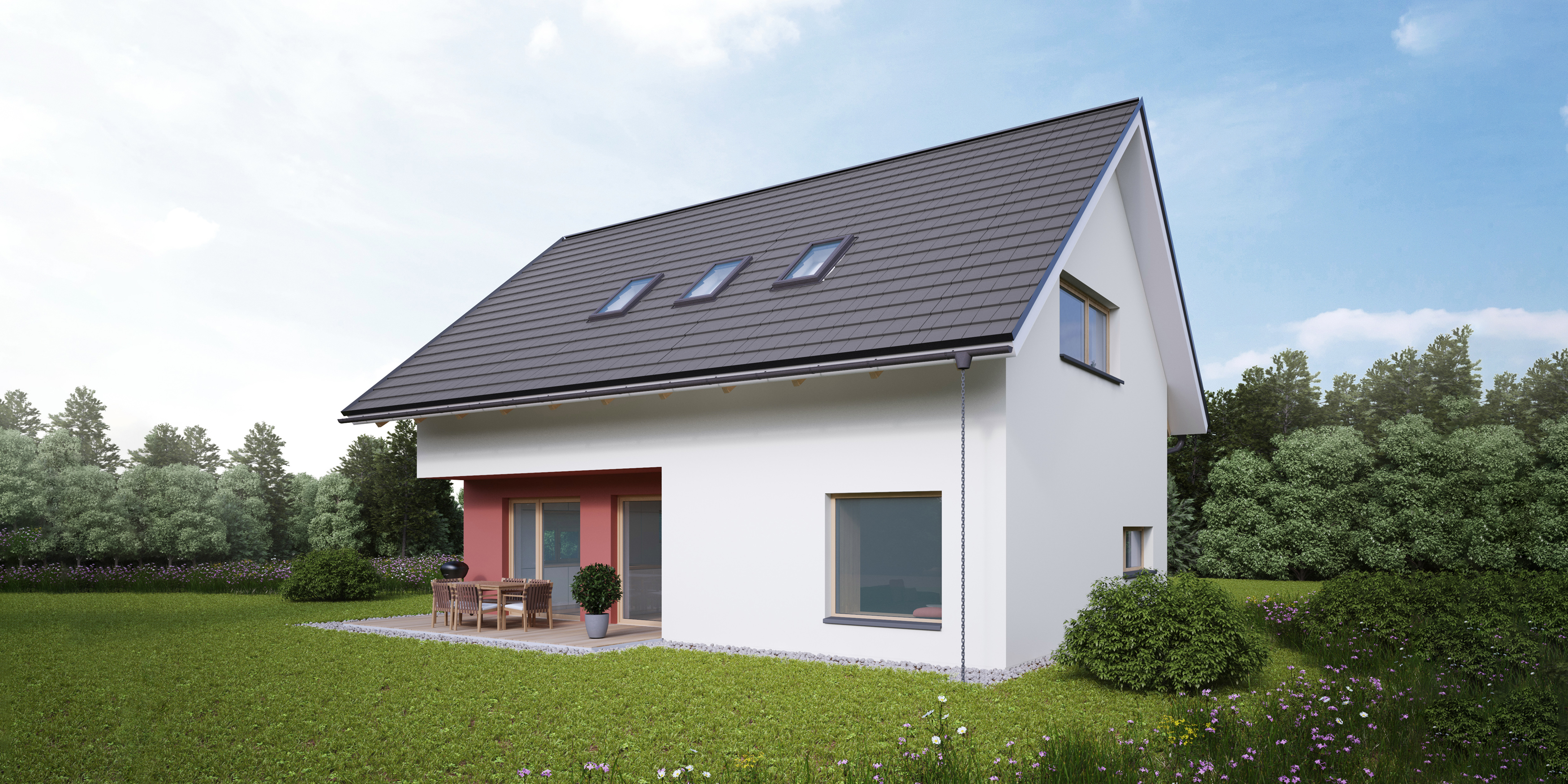 Konzolni previs mansard senči panoramska stekla in daje zavetje terasi. Mansardo in streho je možno izvesti v različnih oblikah (s strešnimi okni ali frčado), prav tako se lahko na različne načine organizira in orientira osrednji bivalni del, kar poudari individualnost vaše hiše.