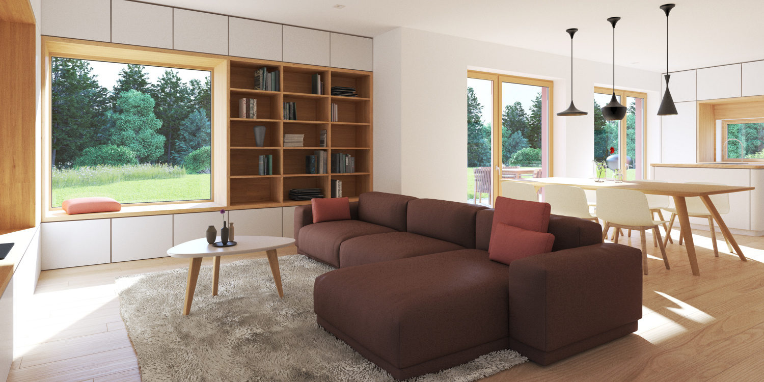 Kompaktna racionalna hiša, katere osrednji del in srce je enoten in svetel bivalni prostor z nanj navezujočo se delovno nišo.